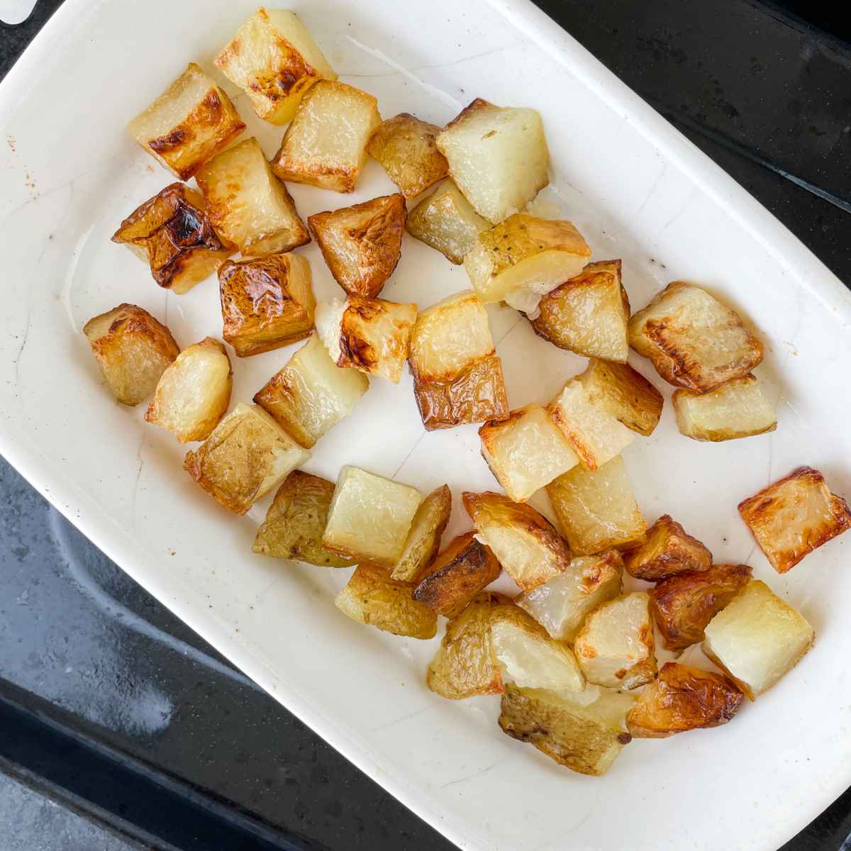 - Remove the potatoes and transfer to a baking dish. Pop it in a preheated oven for about 8 to 10 minutes or until the potato cubes look golden on the outside.