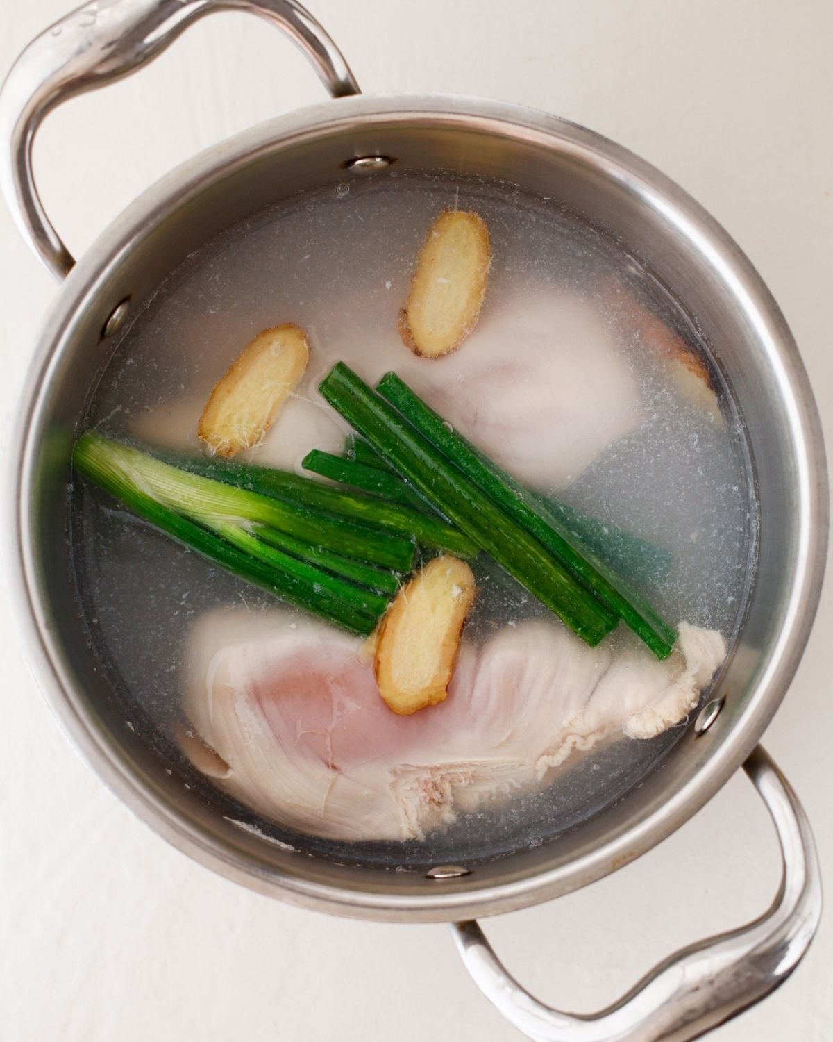 - Add the chicken, ginger, green onions, salt and pepper in a pot with water. Bring it to a boil.