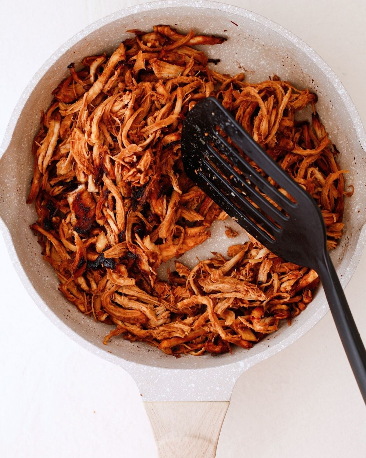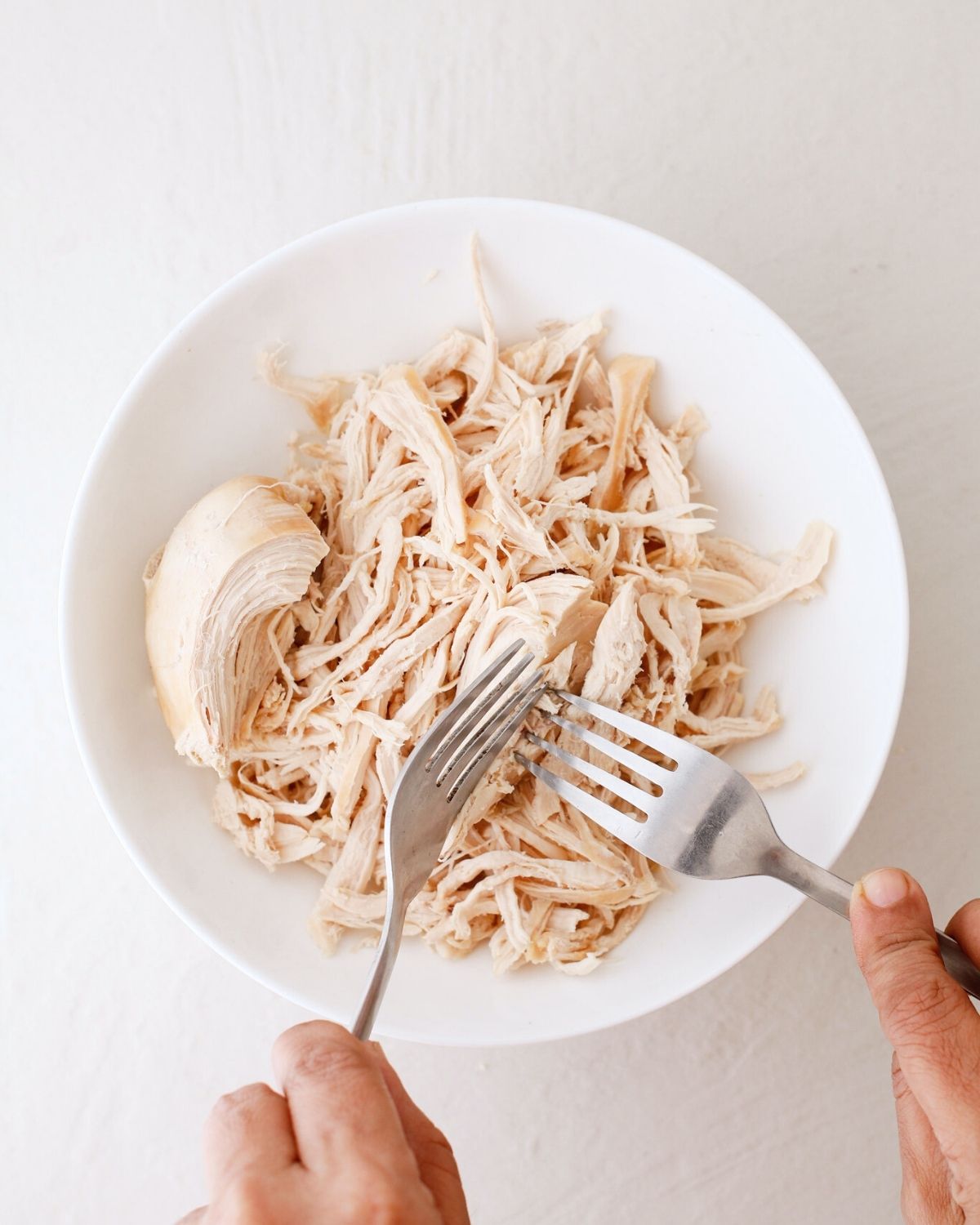 - I really love the texture that I achieved by shredding the chicken with two forks. If you prefer a finer texture, you can use a stand mixer to shred the chicken.