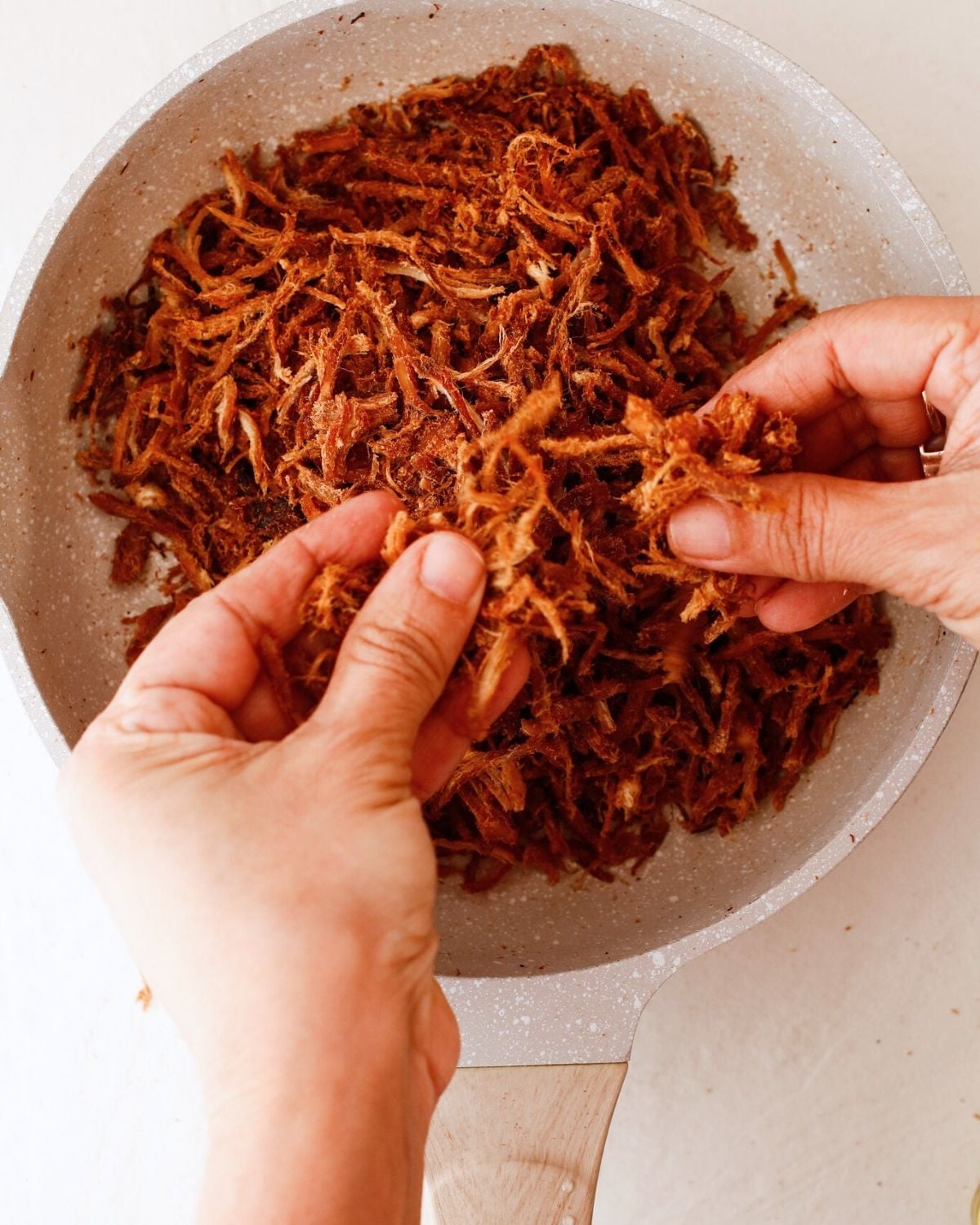 Step 5: Take off heat, allow to cool down and shred a bit more using your fingers.