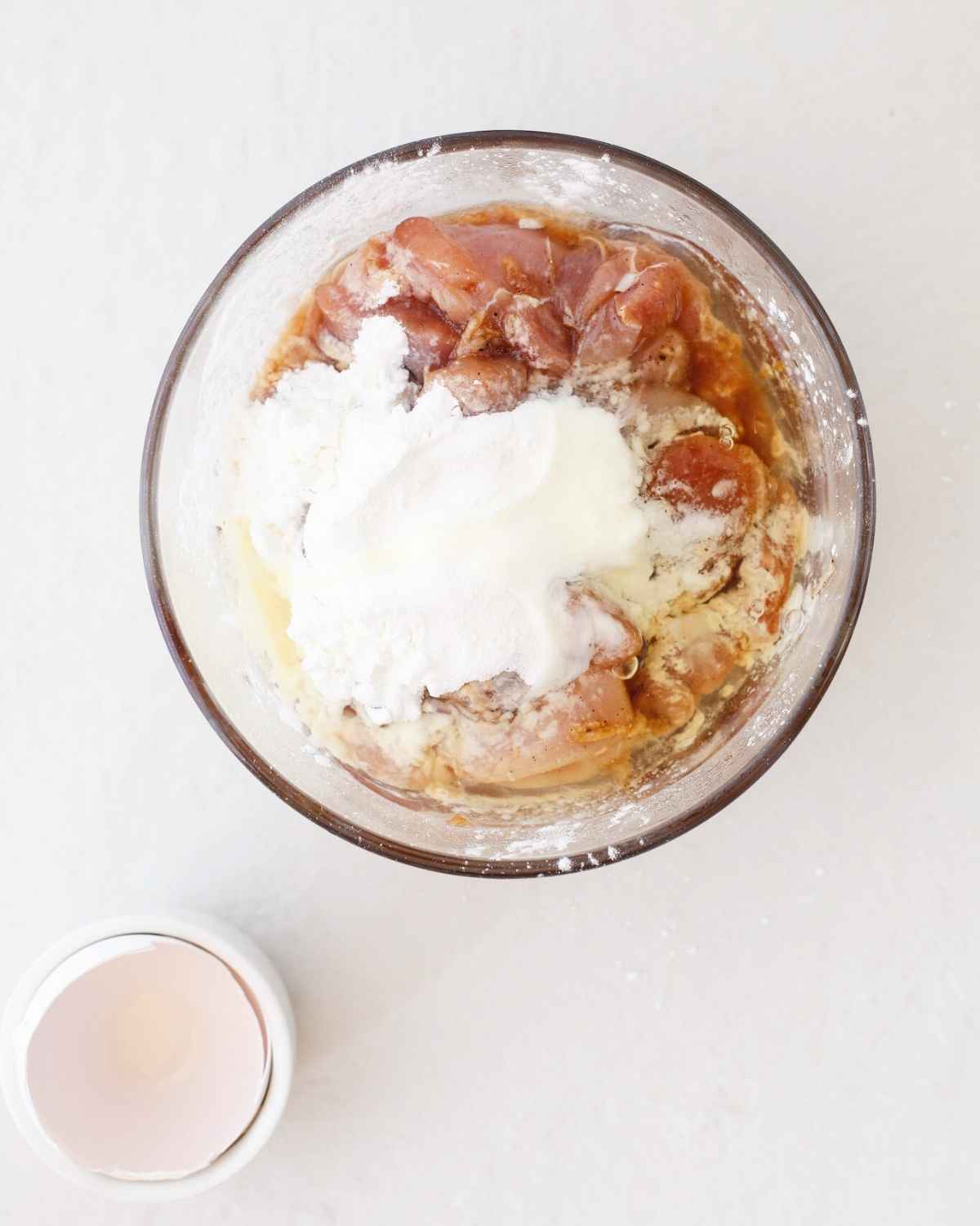 - Next, add the cornflour and egg, and mix well to ensure all the chicken thighs are nicely coated.