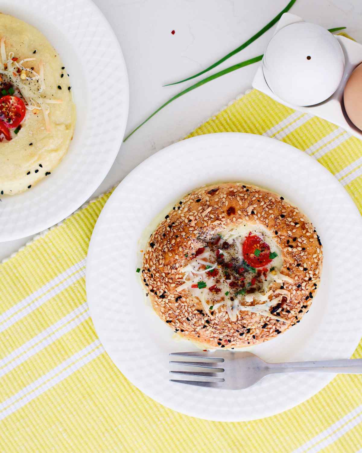 - To keep a nice balance between the egg and bread, I used one sliced half of a bagel with one egg. If you prefer a heartier version, you can use a whole bagel too.