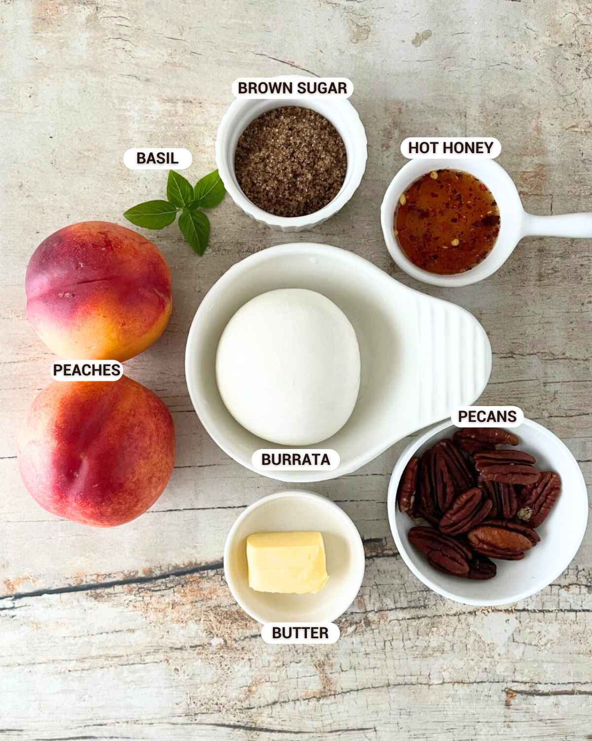 You’ll need just a few ingredients for this peach burrata salad recipe.