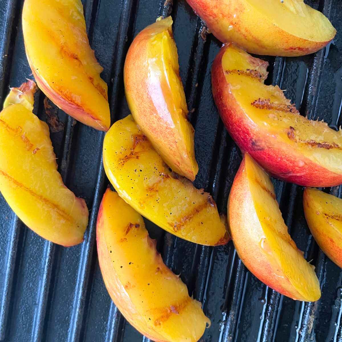Step 1: Cut the peaches in half and then slice them into wedges. Brush the cut side of the peaches with butter or olive oil and place the peaches on the grill.