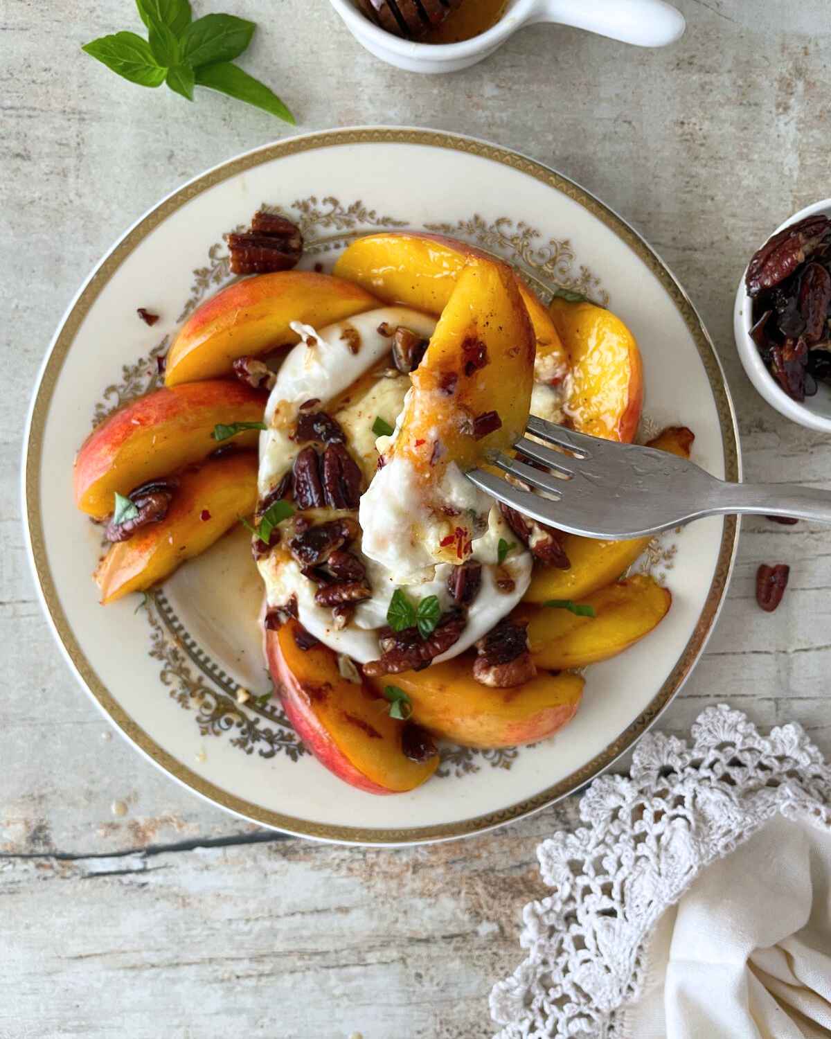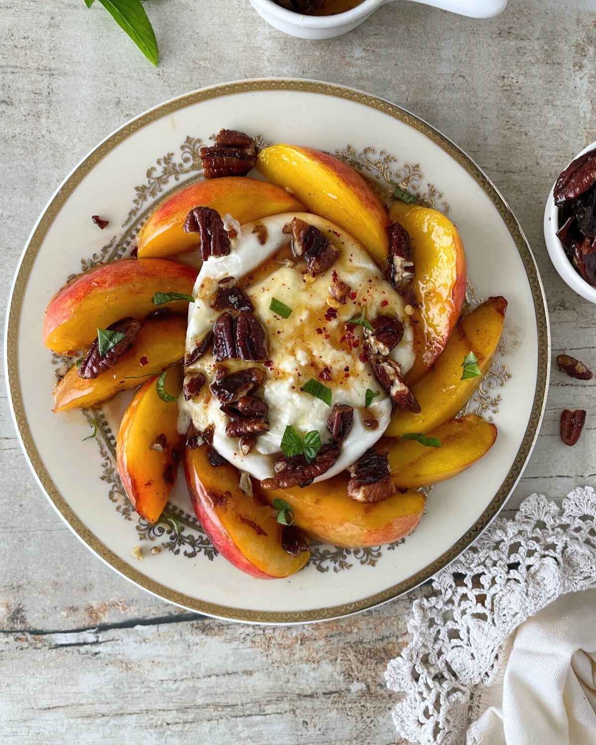 - Grill for 3 minutes or until you get some char marks and assemble the salad. Cut open a Burrata in the center of a plate and place the sliced peaches all around. Drizzle a little olive oil and hot honey and sprinkle some candied pecans and chopped basil.