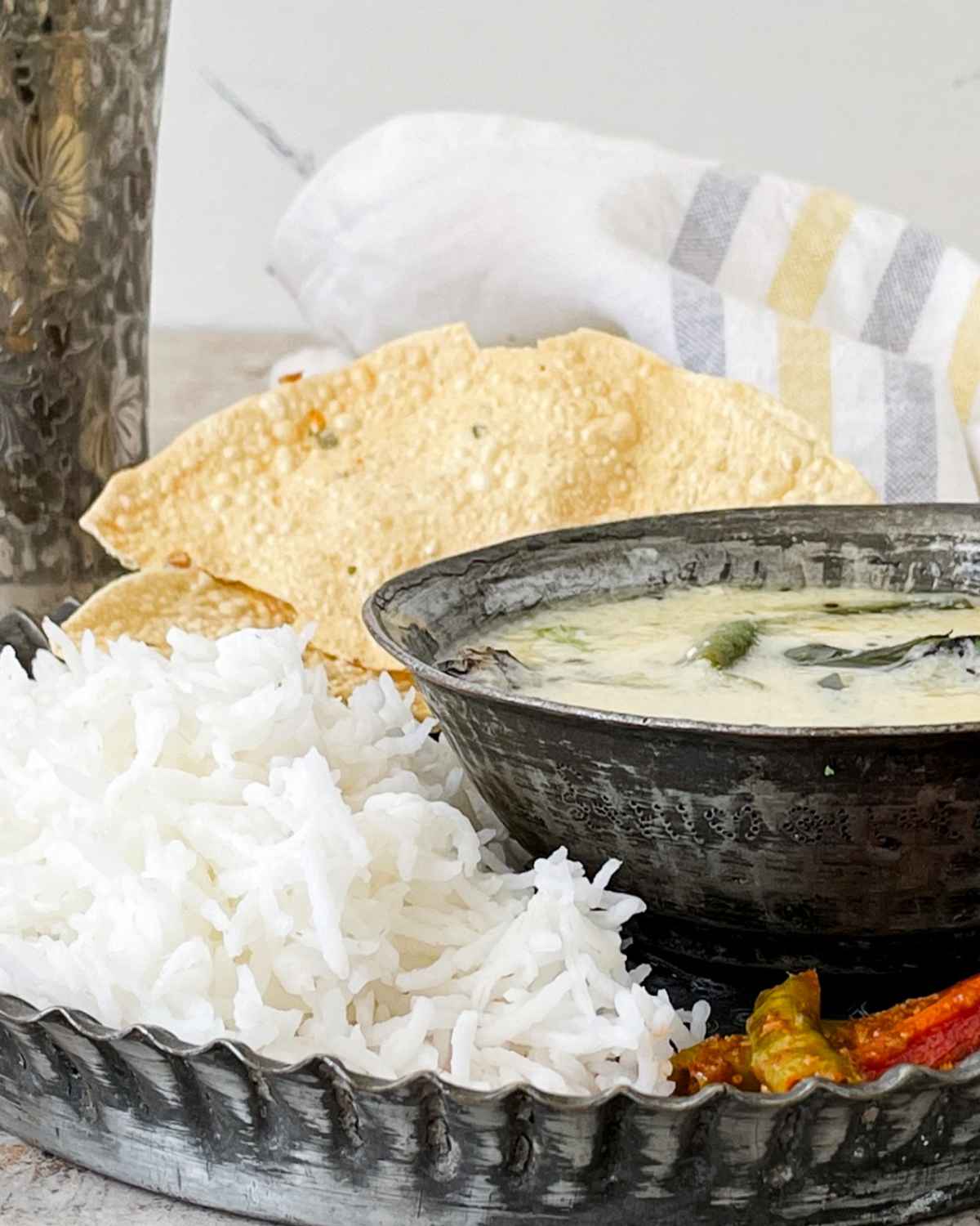 This sour and sweet white kadhi makes for the perfect comfort food when served with some rice and a crunchy salad or poppadom. I love having my Masala Papad as a side with this Kadhi.