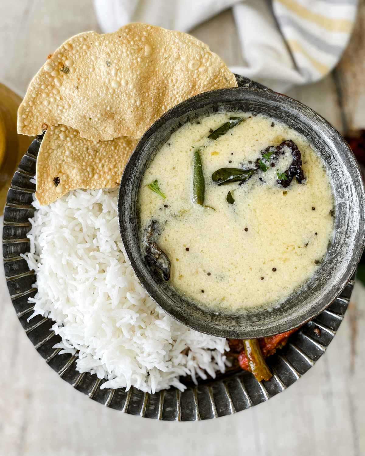 Remember that this version of kadhi doesn’t have turmeric powder or any pakoras added in, and isn’t typically served with khichdi, but rather with rice.