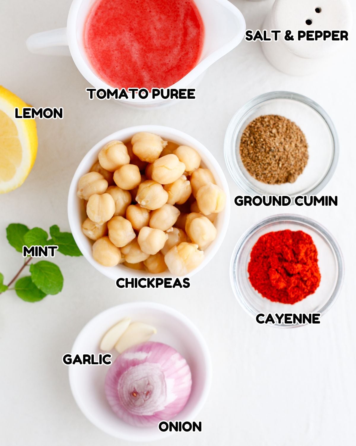 - 📋Main ingredients: Chickpeas, tomato puree, lemon juice, onion, garlic, mint, cumin, cayenne mint and seasonings.