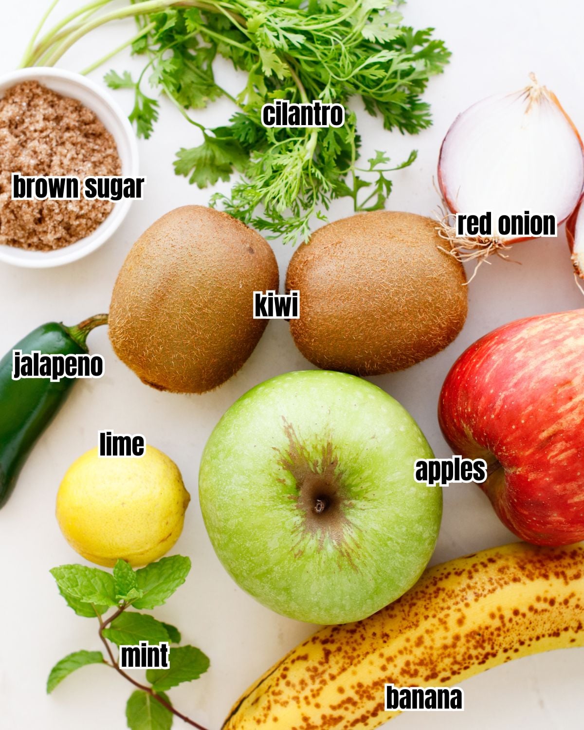 - 📋Main ingredients: Apples, kiwi, banana, jalapeno, red onion, brown sugar, lime juice, fresh herbs.
