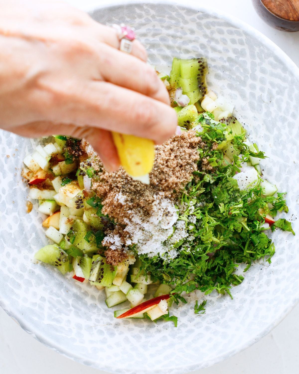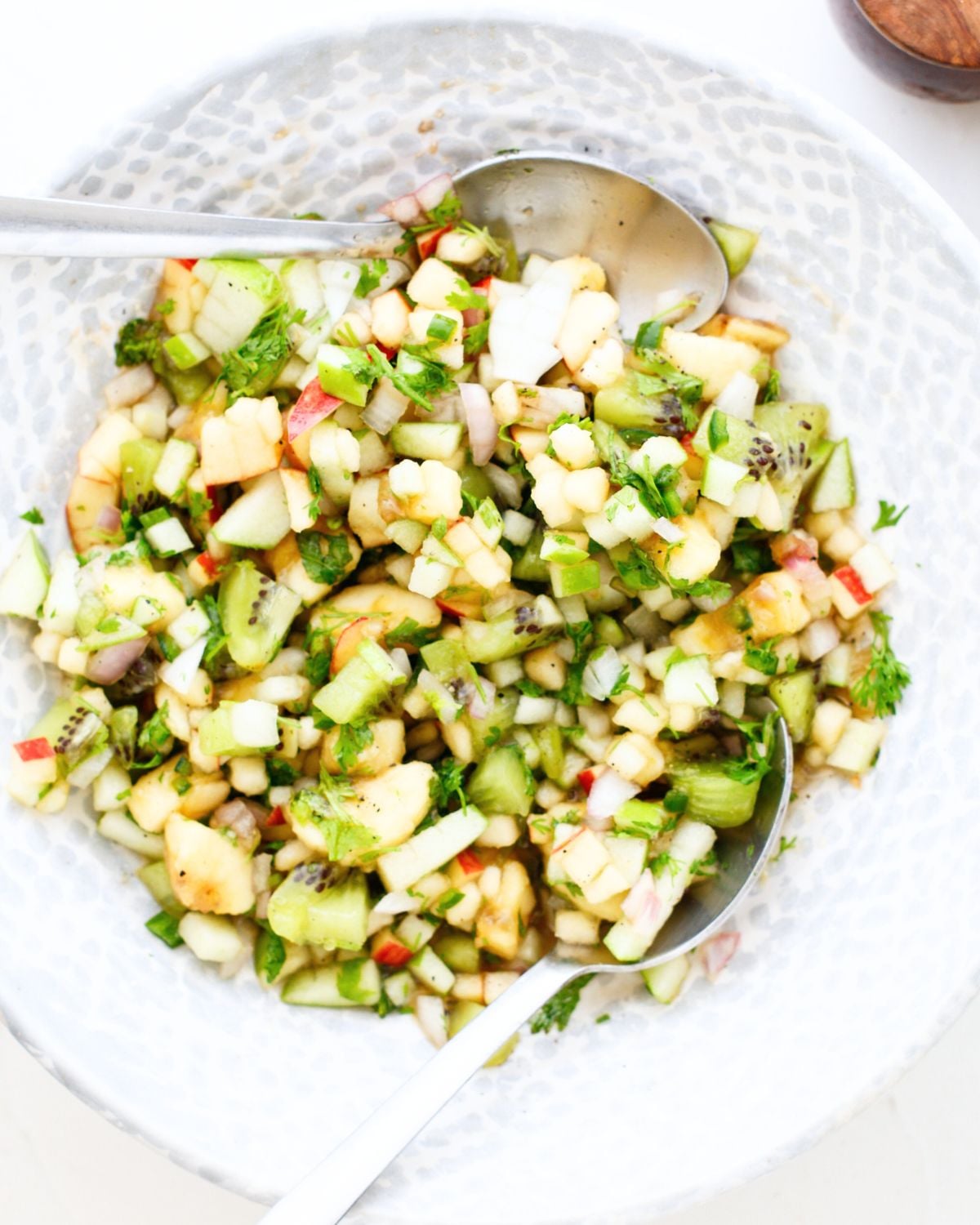 I've used fresh pineapples to make my favorite strawberry pineapple salsa and jalapeno pineapple salsa, and juicy mangoes got transformed into my mango Pico de Gallo. This time, I had some fresh kiwis and apples that I wanted to use up, and a quick salsa seemed like the best idea.