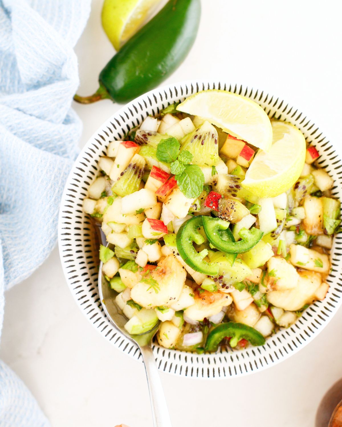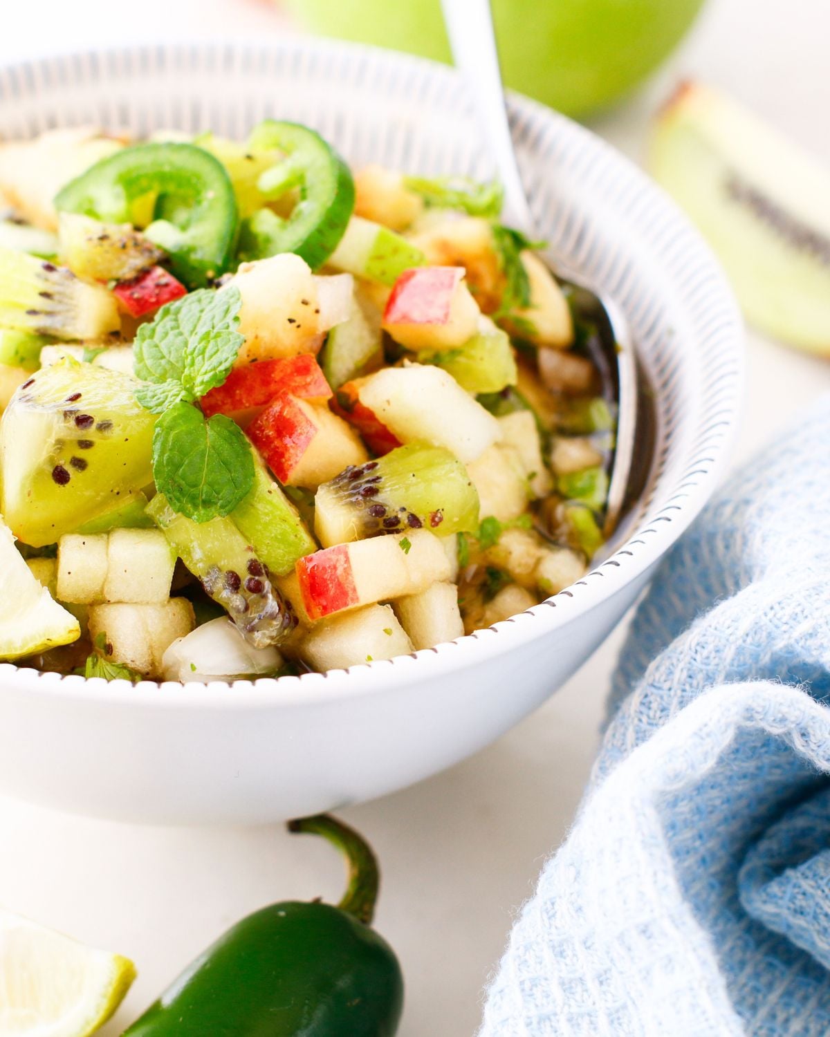 Sweet, spicy and tangy, this kiwi apple salsa comes together in just 10 minutes, and is the easiest side you'll make this summer.