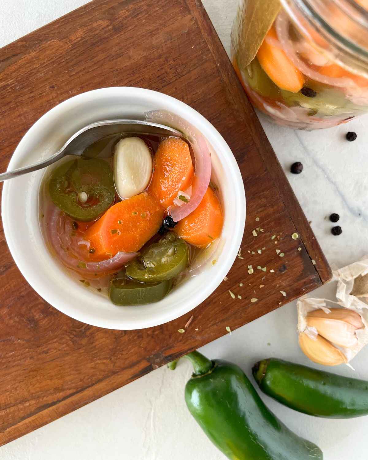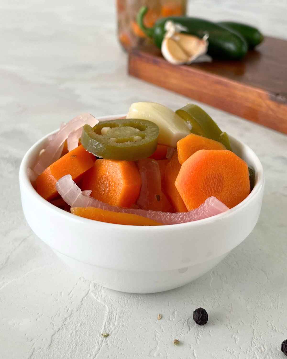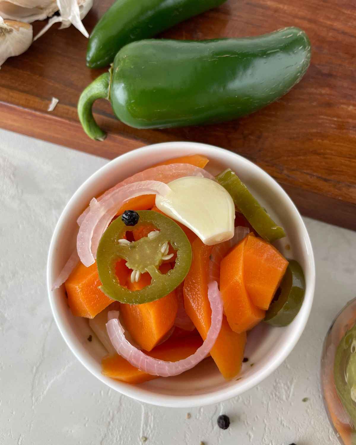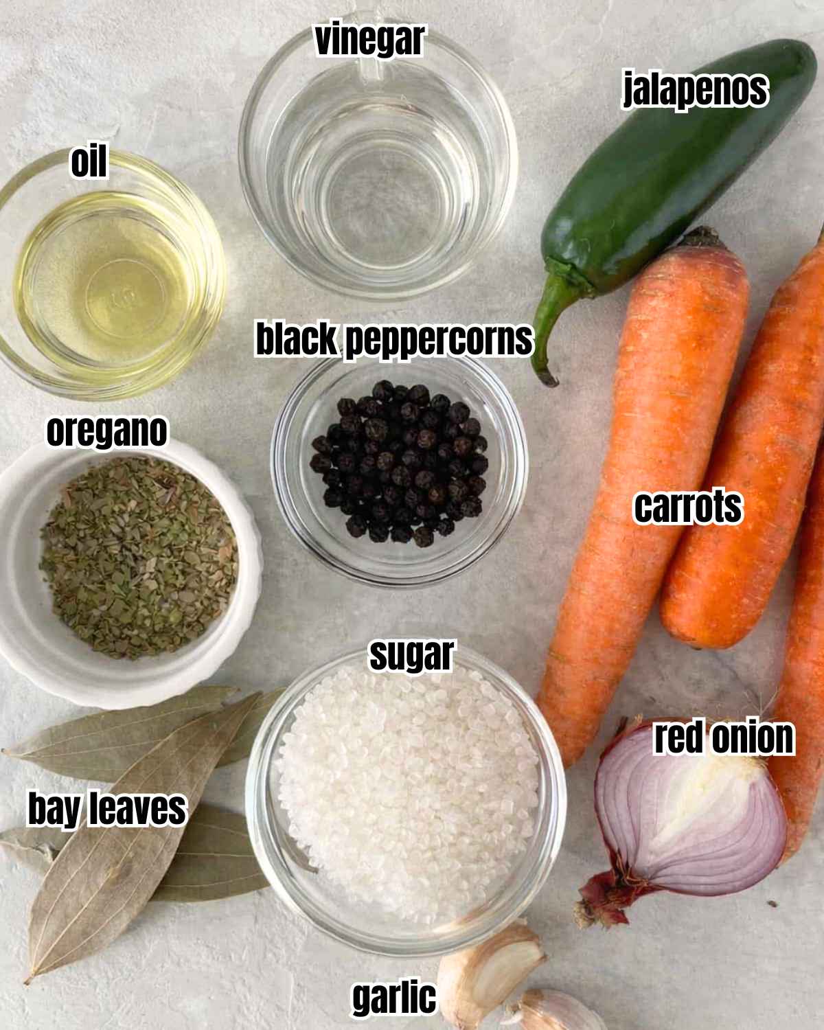- 📋Main ingredients: Carrots, garlic, jalapenos, red onion, oregano, sugar, black peppercorns, bay leaves, vinegar, oil.
