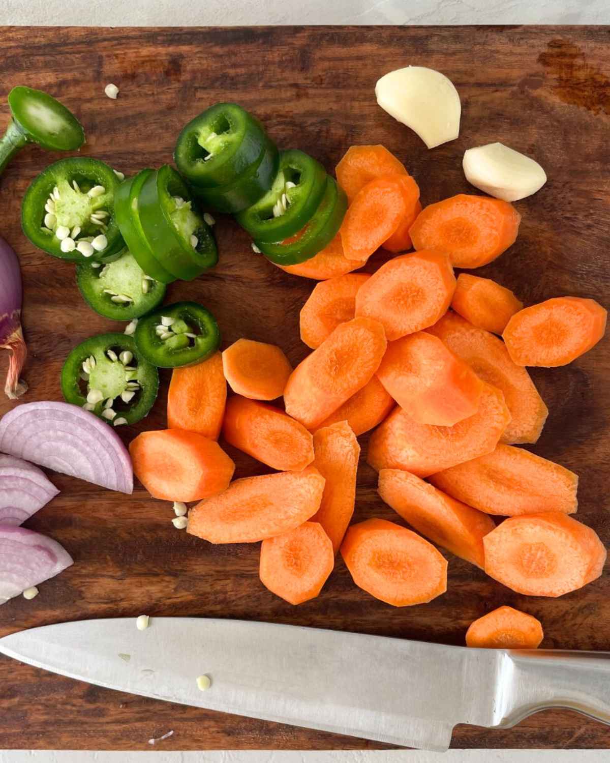- Peel and slice carrots, jalapenos and onions.