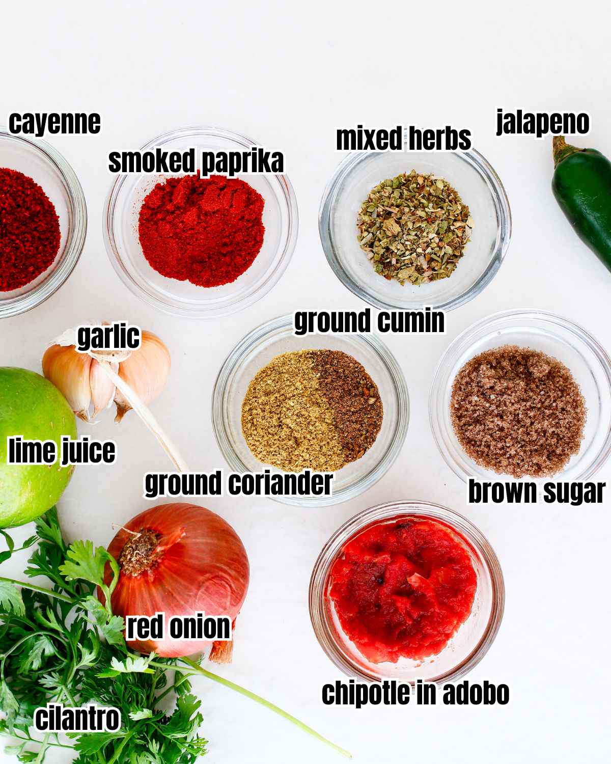 Seasonings: You'll need ground cumin, ground coriander, mixed herbs, some smoked paprika, cayenne and brown sugar.