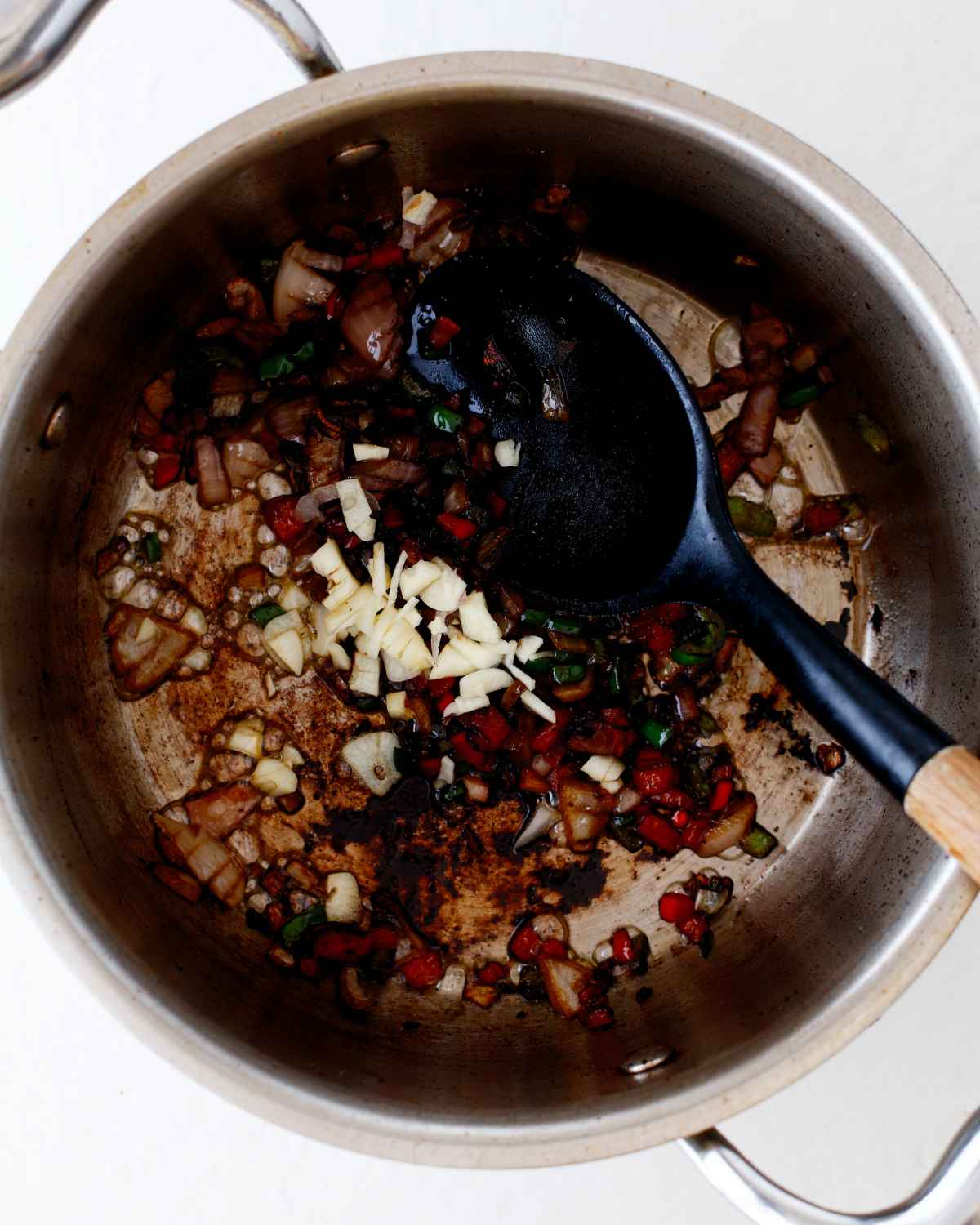 Step 3: Remove and set them aside and add chopped garlic, onion and peppers to the same pot.
