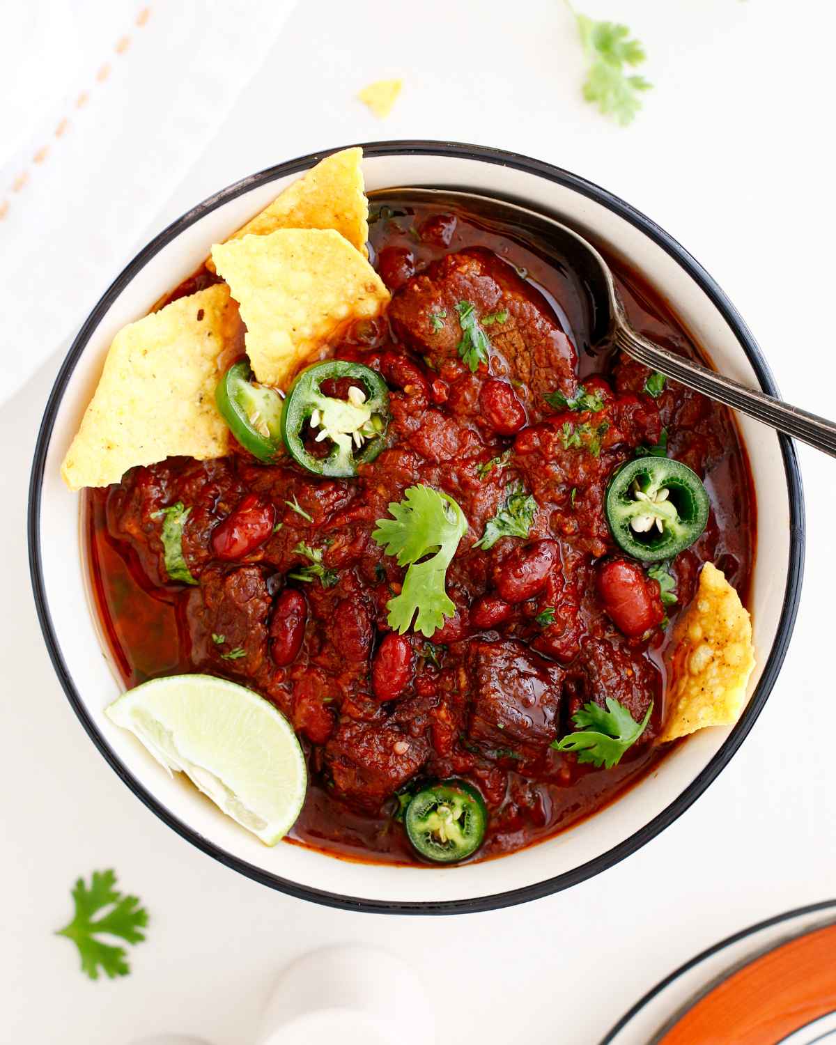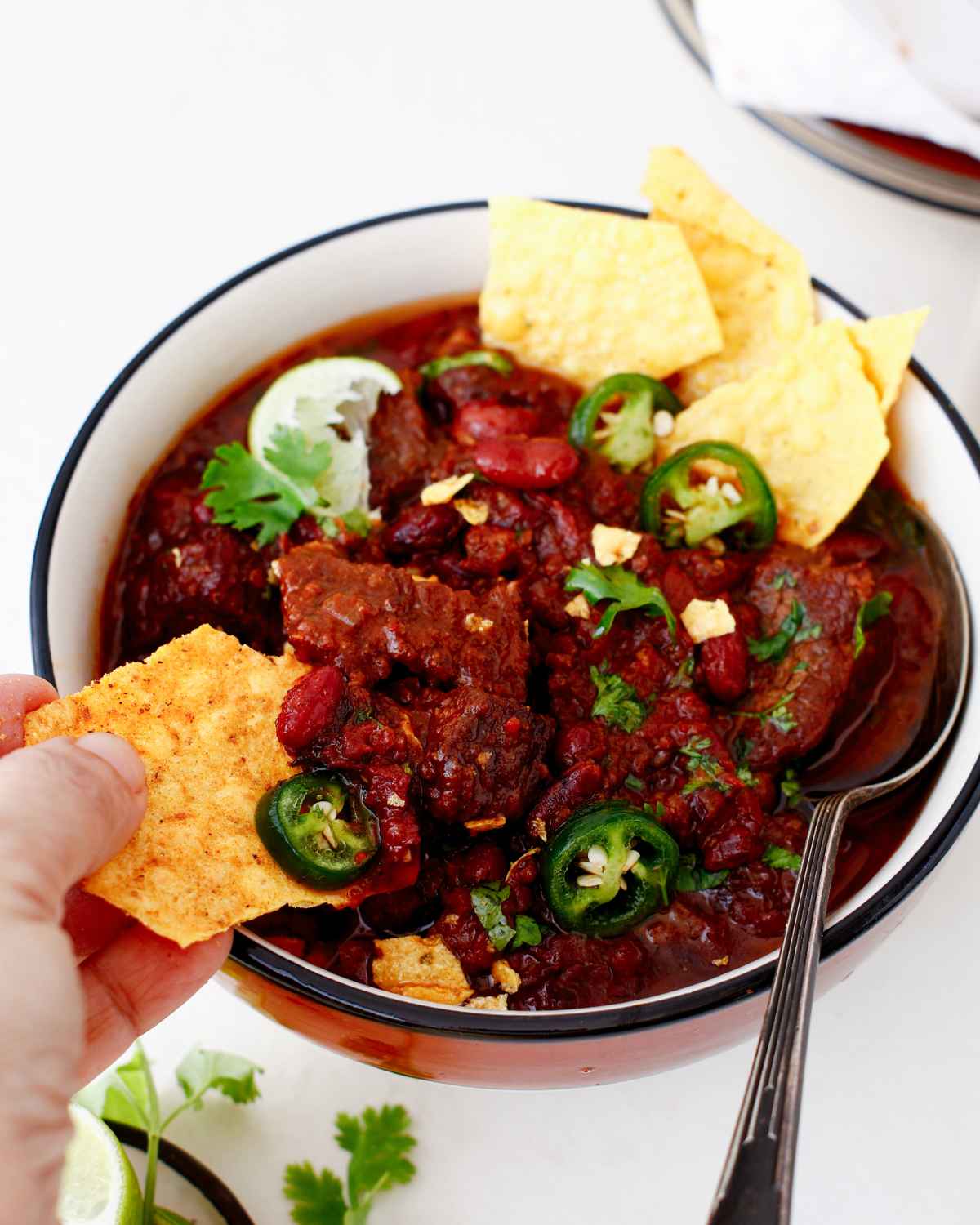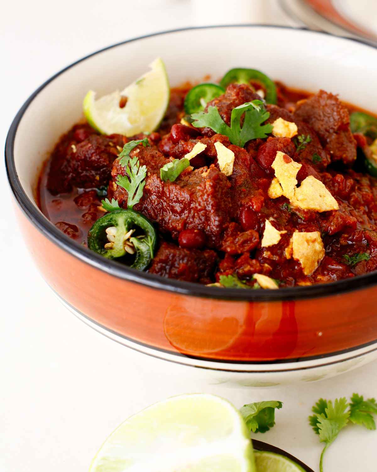 Top your bowl of Chili con Carne with a dollop of sour cream or guacamole to balance out the heat, or just some shredded Mexican cheese. I love topping mine with a spoonful of my avocado lime crema and crunchy Mexican pickled carrots or my favorite Mexican pickled vegetables.
