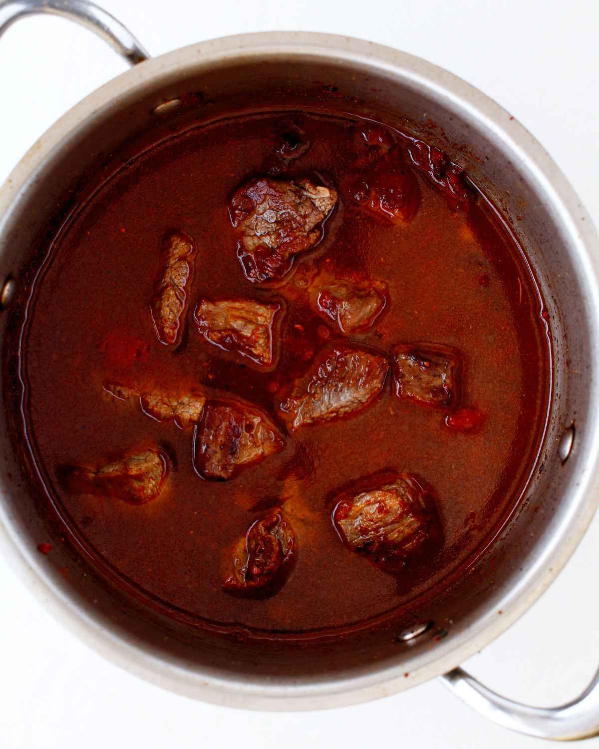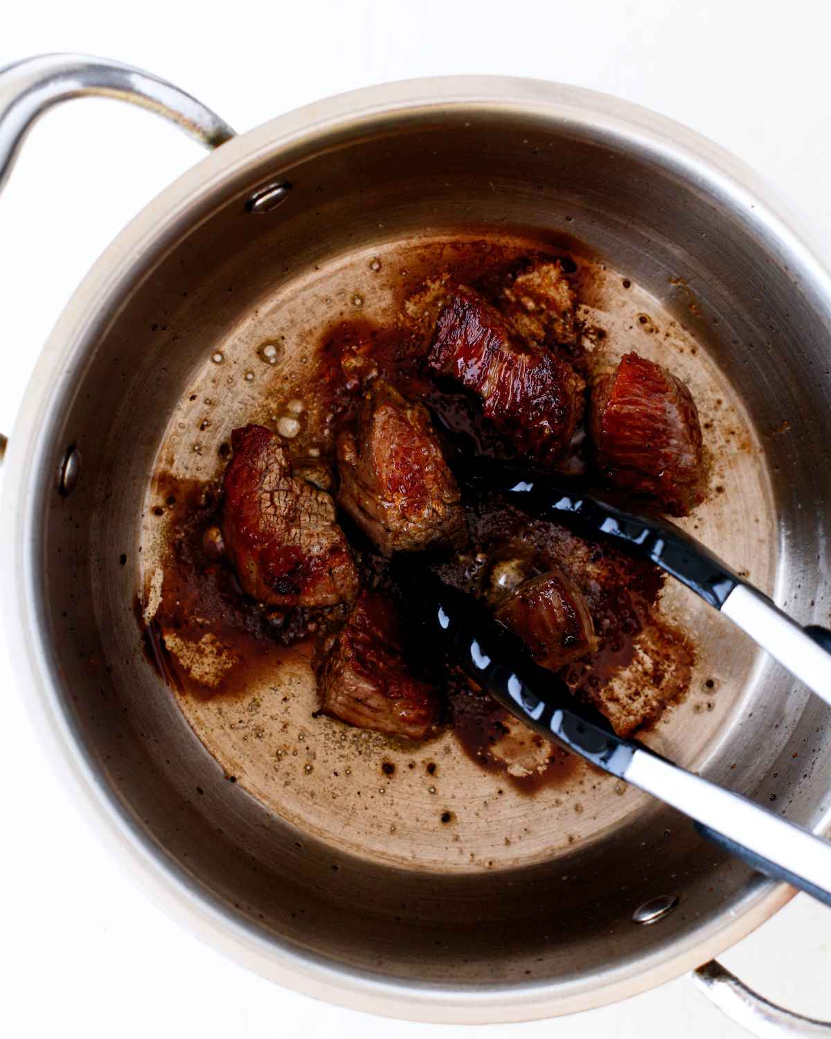 - Heat oil in a pot and sear the beef chunks over high heat for 3 minutes on each side, until golden brown and caramelized.