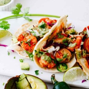 Serve these Tajin shrimp tacos with some more of the avocado jalapeno sauce on the side, and some Mexican grilled onions to make it a wholesome meal. I love pairing my tacos with a side of Mexican pickled vegetables or some Mexican roasted potatoes, and a nice salsa like corn Pico de Gallo or avocado Pico de Gallo.